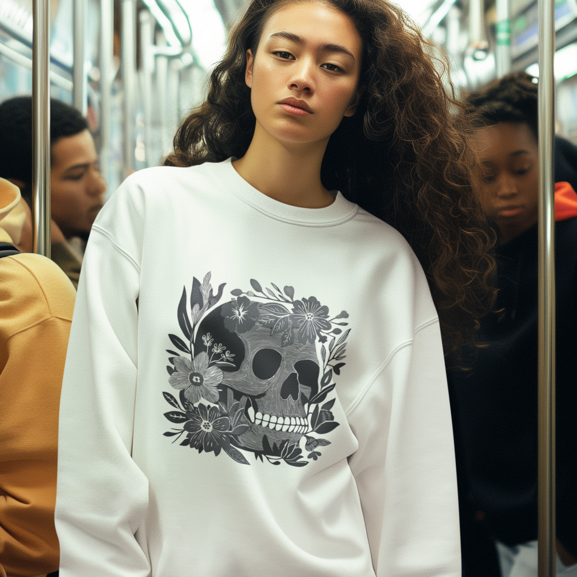 Affirmez votre style avec ce pull original mêlant force et délicatesse. Son imprimé unique met en scène un crâne humain finement détaillé, niché dans un écrin de fleurs sauvages et de feuillages tropicaux. Un contraste saisissant, idéal pour un look à la fois rock, artistique et intemporel.