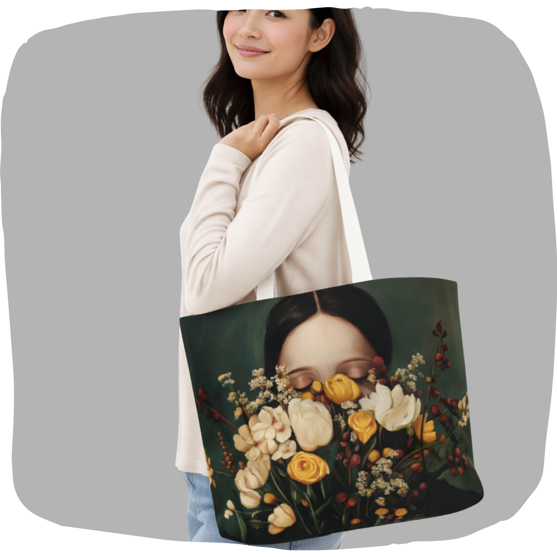 Plongez dans un univers de douceur et de mystère avec ce sac cabas unique. L'illustration, évoquant les natures mortes de l'époque renaissance, met en scène un visage féminin aux yeux clos, partiellement dissimulé derrière un bouquet foisonnant de fleurs sauvages et de baies. Un design profond sur fond vert forêt qui apporte une touche de poésie dramatique à votre quotidien.