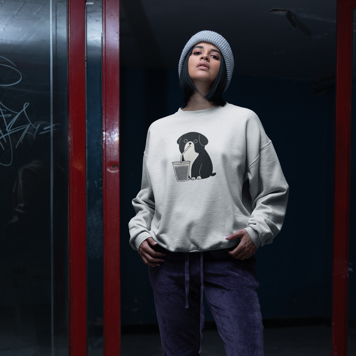 This sweater will appeal to dog lovers and fans of playful streetwear. It features a fun illustration of a dog drinking iced coffee. Minimalist, quirky, and irresistible, this design is sure to catch the eye and make you smile.