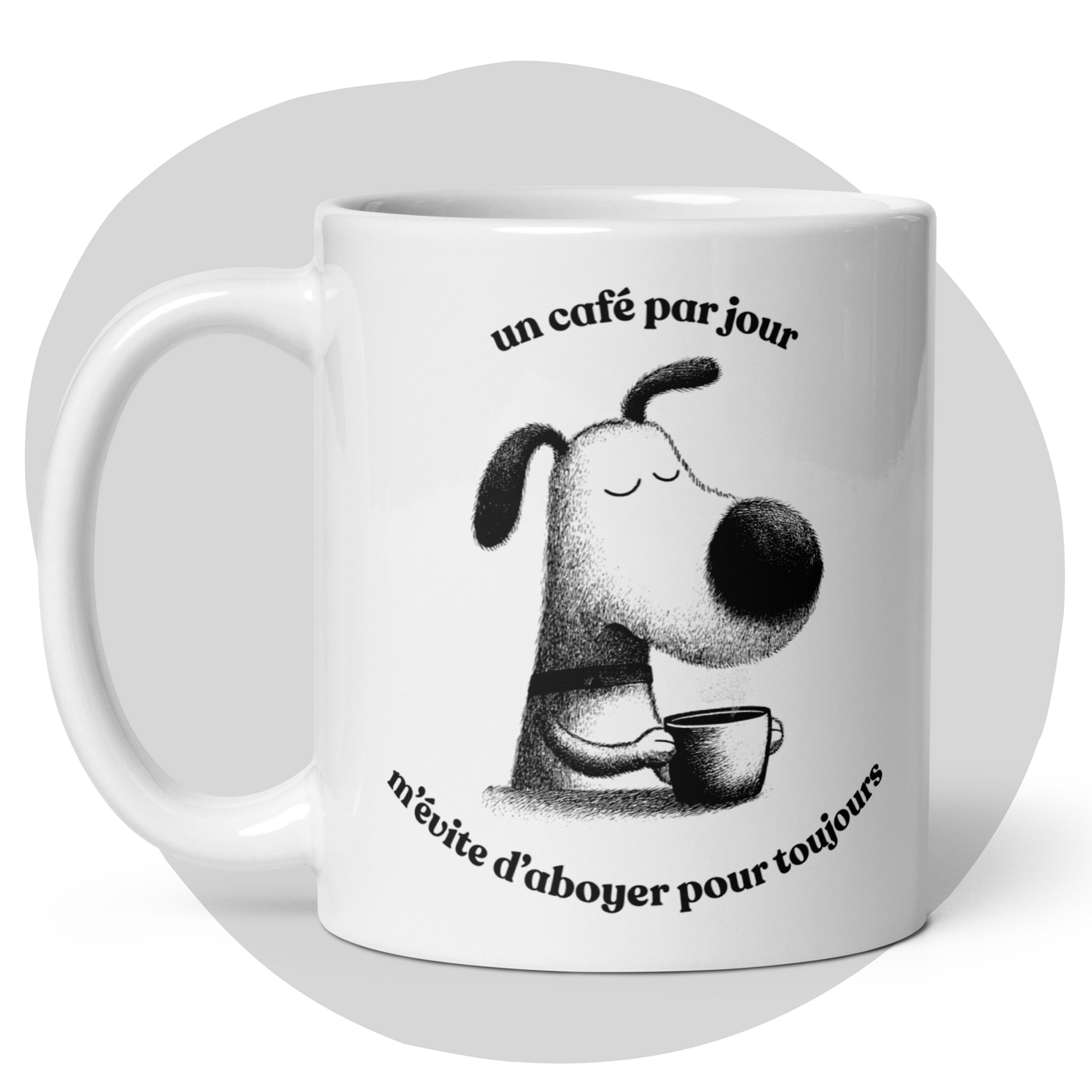Cette tasse au design unique met en vedette un adorable chien dégustant une tasse de café, avec la citation amusante: Un café par jour m'évite d'aboyer pour toujours. Durable et originale, elle deviendra votre compagnon préféré le matin.