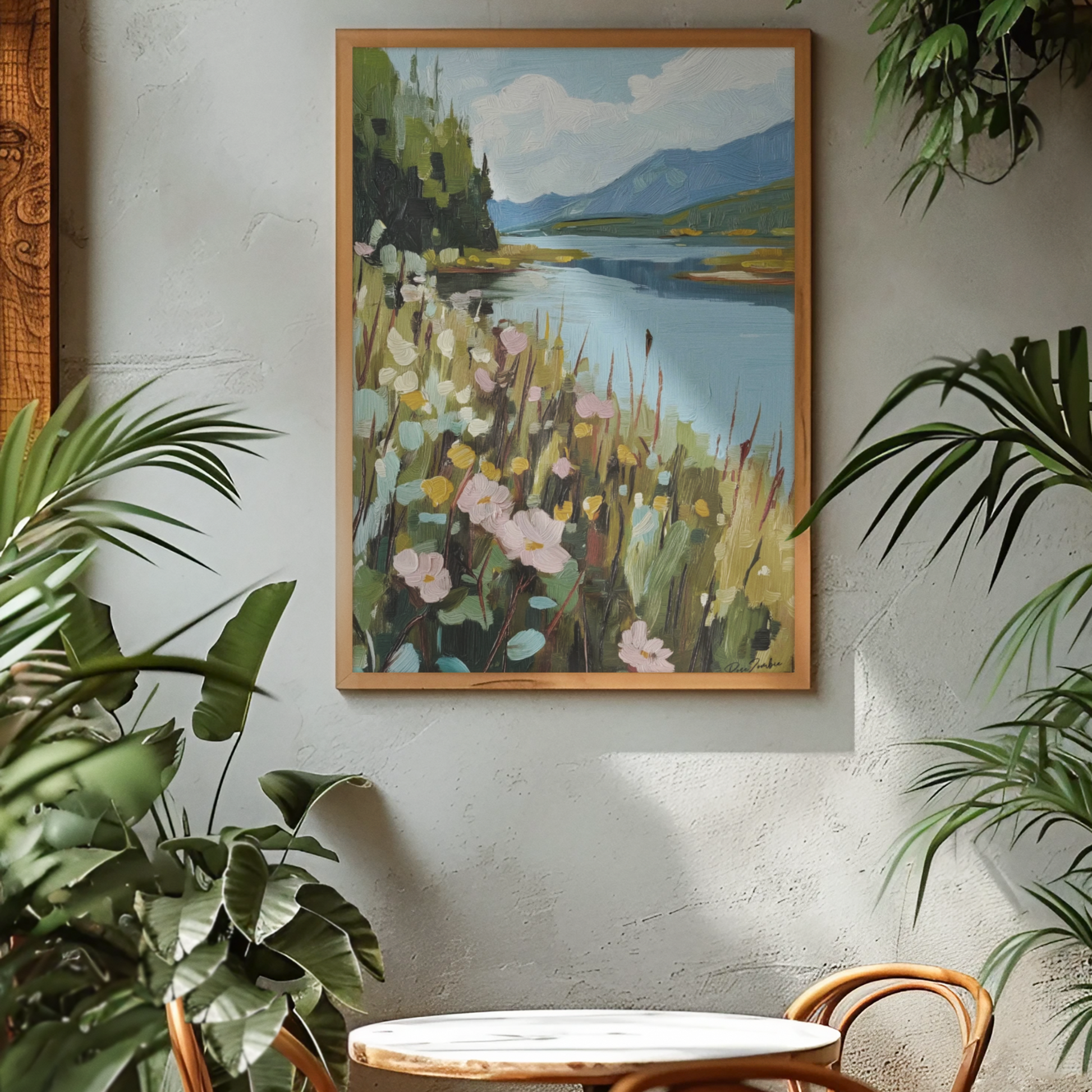 El estilo pictórico, rico en texturas y matices, captura un paisaje bucólico de verano con sutileza y refinamiento.