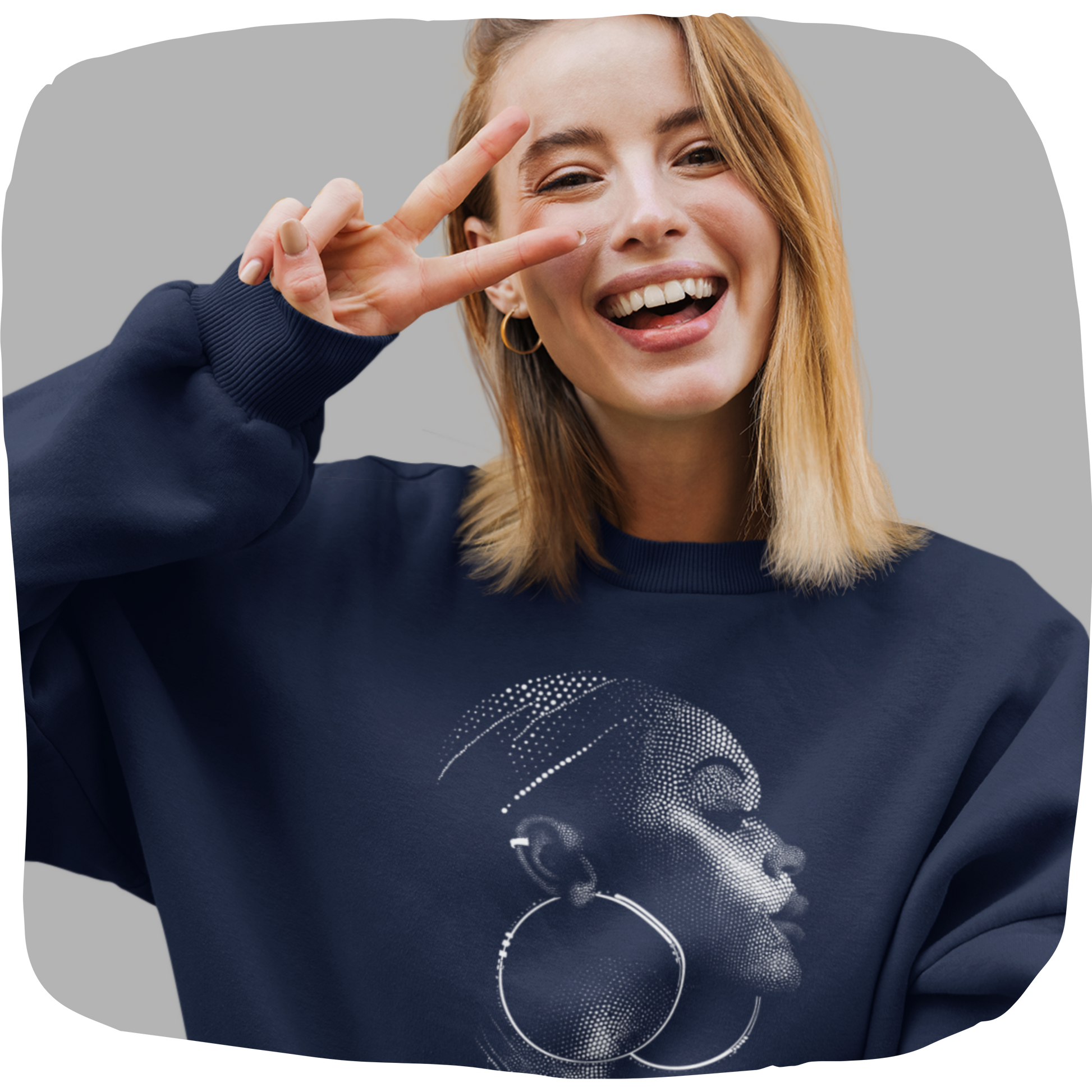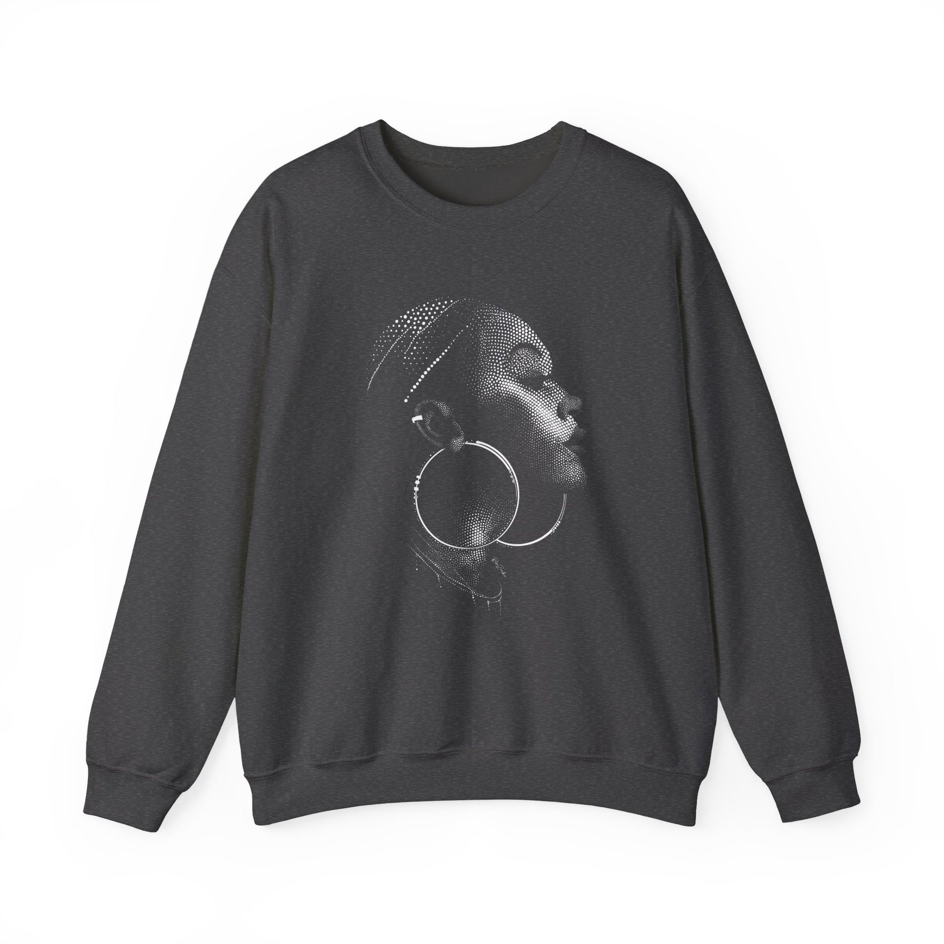 Ce sweatshirt arbore l'imprimé d'une femme noire de profil, la tête relevée, dans un style pointilliste très raffiné. Il respire l'élégance et la sophistication, parfait pour celles et ceux qui souhaitent affirmer leur style vestimentaire.
