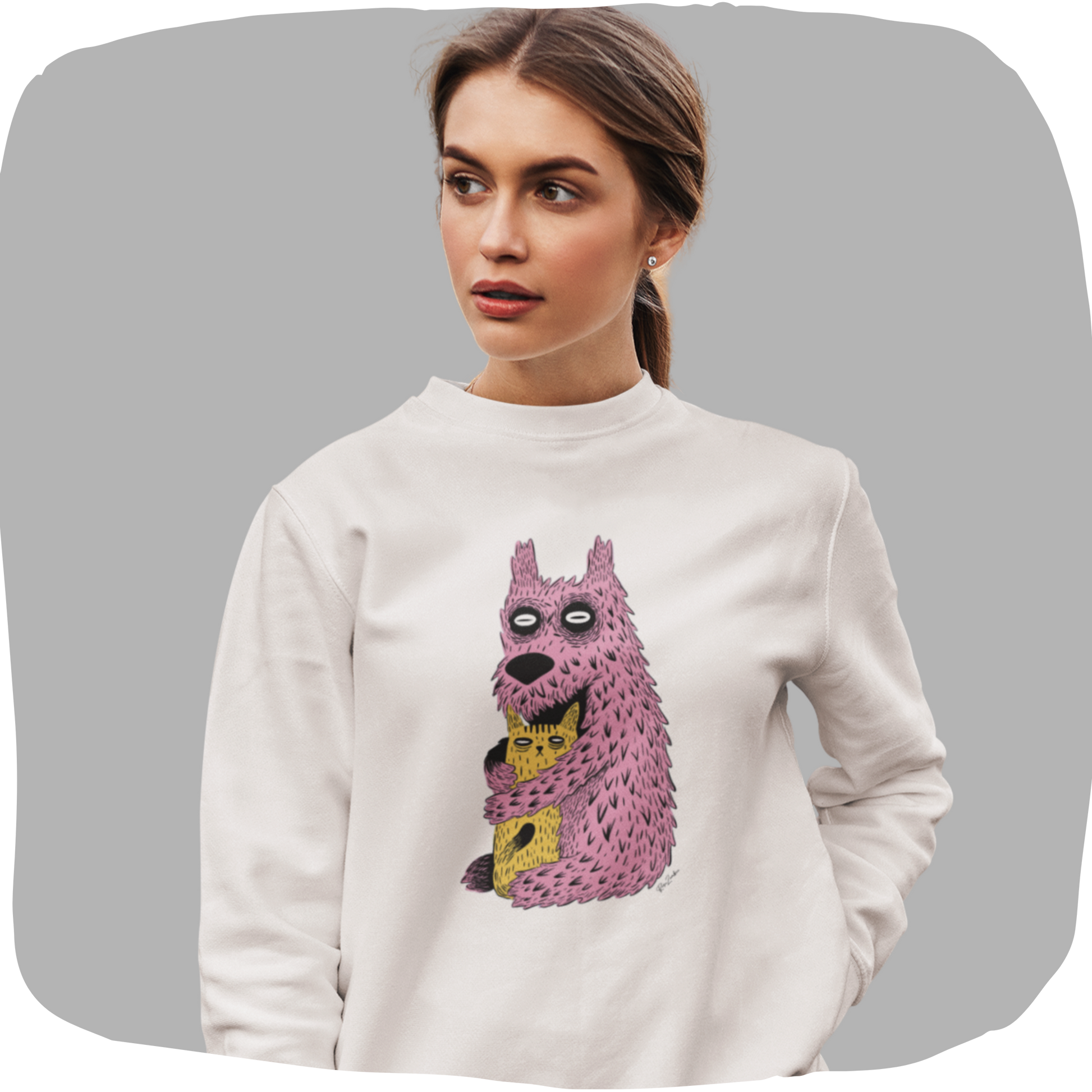 Ajoute une touche d’originalité à ta garde-robe avec ce pull en coton bio orné d’une illustration unique et colorée représentant deux créatures excentriques se serrant dans les bras. Ce design ludique et décalé est une véritable œuvre d’art portable, parfaite pour les amoureux de mode créative et les passionnés de vêtements qui racontent une histoire.