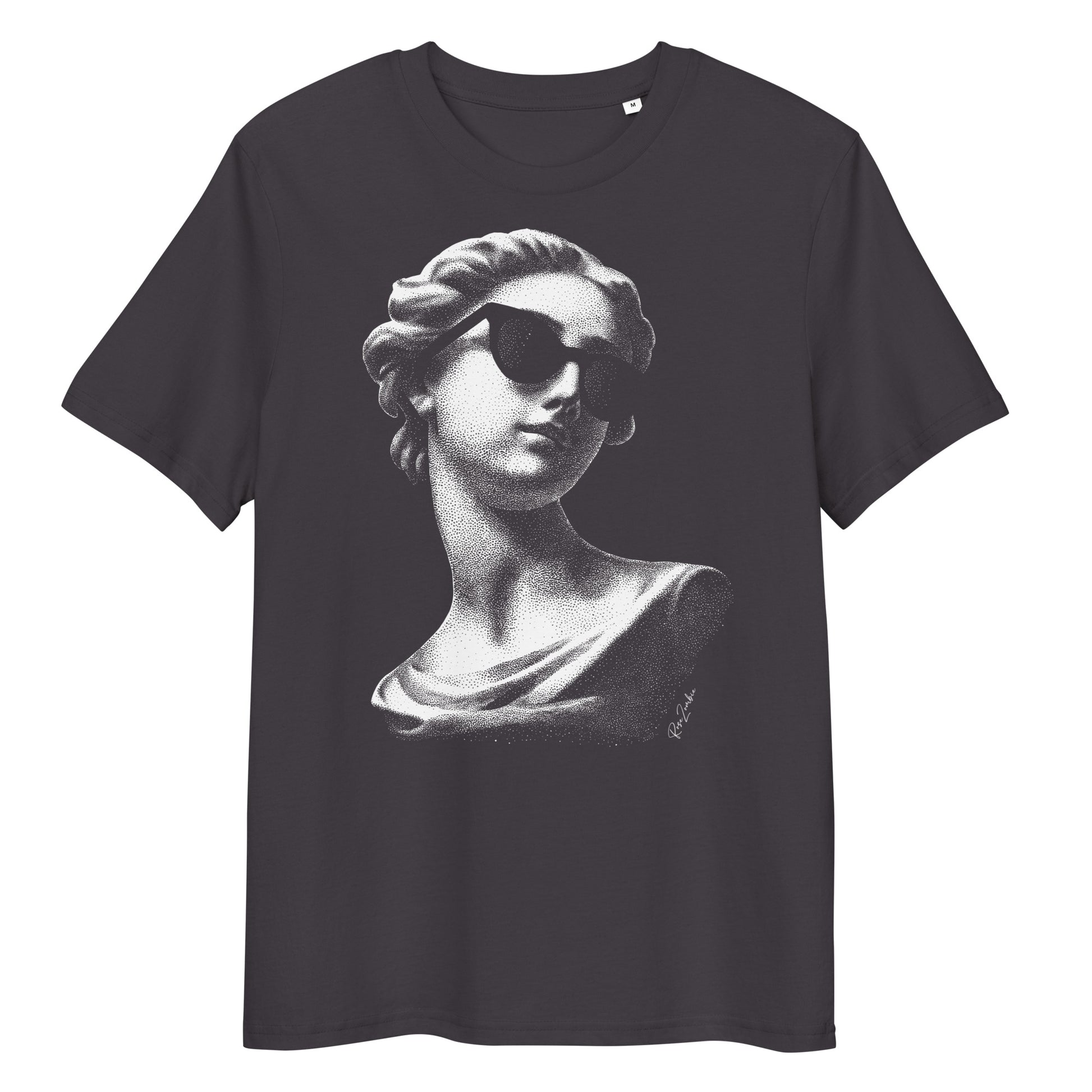 Ce t-shirt unisexe en coton biologique est une ode au contraste entre l’histoire et la modernité. L’imprimé représente un buste de statue gréco-romaine arborant des lunettes de soleil noires, clin d’œil audacieux au mélange des genres et des époques.